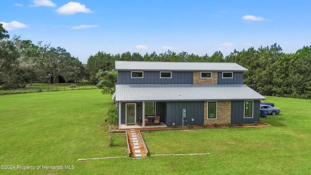 Tucked away at the end of a quiet cul-de-sac and just a short ride from the Withlacoochee State Forest, this 2019 custom-built home offers the perfect blend of barndominium charm and high-end craftsmanship. Designed with both style and function in mind, this 3-bedroom, 3-bathroom home spans 2,200+ square feet and features a second-floor flex space, ideal for a home office, guest suite, or hobby room. Inside, vaulted, beamed ceilings and a stunning floor-to-ceiling wood-burning fireplace create a warm and inviting atmosphere. The custom cabinetry, stone countertops, designer lighting, and high-end fixtures showcase exceptional attention to detail. The spa-like master suite boasts luxurious designer tile, trending paint colors, and an oversized bath, offering a true retreat. Large windows throughout the home bring in an abundance of natural light and frame breathtaking views of your private homestead. The property itself is perimeter-fenced and adorned with majestic grandfather oaks, offering rich soil and plenty of space for horses or livestock. Surrounded by similar agricultural-style properties, this is the perfect place to embrace country living with modern comforts. All information is deemed accurate to the best of the sellers and listing agents knowledge. All pertinent information to be confirmed by the buyer/buyers agent.