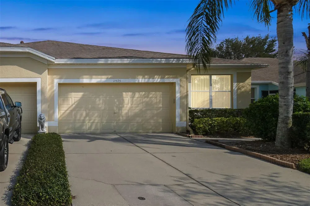 Welcome to 11575 Captiva Kay Dr., a stunning WATERFRONT VILLA in the highly sought-after Rivercrest community. This **MAINTENANCE-FREE** section of Rivercrest offers stress-free living with exterior maintenance, landscaping, roof, paint, and building insurance all covered by the HOA—giving you ultimate peace of mind. This single-story, 3-bedroom, 2-bath, 2-car garage home boasts 1,521 heated square feet, a desirable split floor plan, and breathtaking POND VIEWS—perfect for those seeking both comfort and convenience. Step inside to an open and inviting layout, where tile flooring, soaring ceilings, and an oversized great room create a bright and airy atmosphere. The spacious kitchen, the heart of the home, features ample cabinetry, all appliances, a breakfast bar, and a seamless flow into the great room—ideal for entertaining. Sliding glass doors lead to a covered and screened lanai, offering a tranquil retreat with serene water views. The owner’s suite is a true haven, featuring two walk-in closets, an oversized vanity, a soaking tub, a separate shower, and a seperate water closet. The two additional bedrooms are conveniently located at the front of the home, providing privacy and flexibility. Enjoy the convenience of an inside laundry room with a full-size washer and dryer, as well as direct access to the attached two-car garage. Rivercrest offers resort-style amenities, including separate adult (all ages allowed) and family pools, tennis and basketball courts, a playground, a clubhouse, and scenic trails. Located just minutes from shopping, dining, top-rated schools, hospitals, and with easy access to Rt 301 and I-75, this home offers both a serene setting and ultimate convenience. Don’t miss this incredible opportunity—schedule your private tour today!