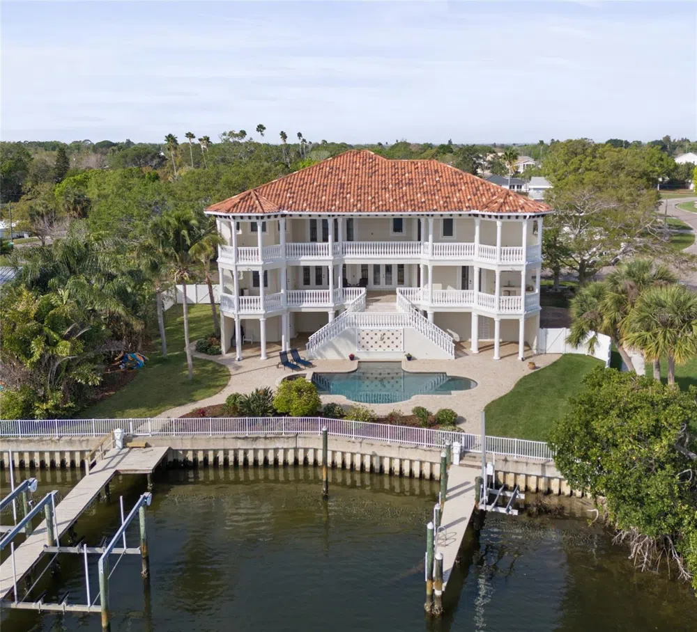 Your own private mini marina! This magnificent estate is situated on a true double lot with over 110' of deep sailboat waterfront, no fixed bridges to the Gulf, and panoramic views of Tampa Bay and Weedon Island Preserve. This waterfront oasis boasts dual docks with a 12,000 lb lift, 10,000 lb lift, PWC lift, and pilings to moor your yacht. The ultimate in luxury, this 4 bedroom, 6 bathroom Mediterranean home contains over 5,900 sqft of exquisite finishes, plus an additional 1,000 sqft bonus room (not included in the living space square footage) with ductless AC/heat and storage space. This home features imported Italian travertine floors that shine like glass, newly refinished walnut hardwood flooring, commercial-grade structural construction (steel beam supports and cement block from the foundation to the top of the 3rd floor), custom cabinetry, one indoor and two outdoor fireplaces on each of the two 1,100 sq ft balconies overlooking open views of Tampa Bay and Weedon Island, an outdoor kitchen, an elevator to all 3 levels, and a custom oversized garage perfect for parking up to 7 vehicles. The grand floor plan offers formal dining and living rooms as well as an eat-in gourmet kitchen, office, library, luxury bar room, and breakfast nook.Watch the dolphin and manatee play from one of your docks or balconies. This priceless Bayou Grande location is less than 15 minutes to downtown St. Petersburg and 30 minutes to downtown Tampa and Tampa International Airport. First rate private schools just minutes away (Shorecrest, Canterbury, LCC) and the brand new Mangrove Bay Middle School. Over-the-top quality and lot size make this custom home a masterpiece that could not be duplicated at today's prices. The entire exterior and interior of the home have been freshly repainted. Brand new polyurea (stronger than epoxy!) floors have been installed in the 3000 sqft garage and have a transferable warranty to the new owner. All interior floors are either new or professionally refinished, along with many more updates! AC has six separate zones and all AC units are relatively new. Listing agent is the owner.
