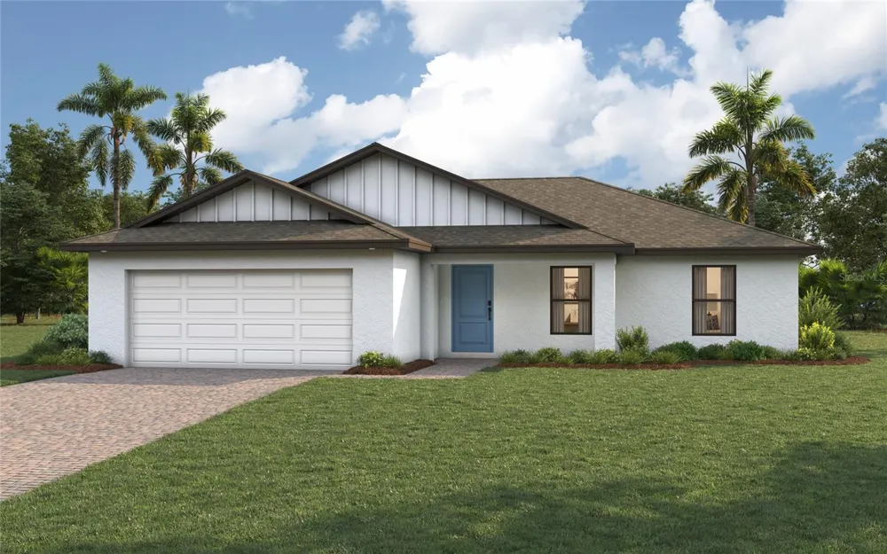 One or more photo(s) has been virtually staged. Under Construction. NEW CONSTRUCTION WITH WARRANTY! Estimated delivery May 2026. The Cayo Costa combines open-concept living with a smart split-bedroom layout, offering three bedrooms plus a den and two bathrooms. Perfectly designed for entertaining, the main living area showcases a soaring vaulted ceiling that seamlessly connects the kitchen, dining area, and expansive Great Room. A large freestanding island provides the ideal centerpiece for both casual meals and social gatherings, while sliding glass doors extend the living space to a covered lanai for effortless indoor-outdoor living. The private Primary Suite is a true retreat, featuring two spacious walk-in closets and a well-appointed en-suite bathroom. On the opposite side of the home, two comfortable guest bedrooms share a full bath, ensuring both privacy and convenience. A versatile den with French doors offers the perfect space for a home office, study, or creative flex room. Highlights of the Cayo Costa include: Quartz countertops in kitchen and baths, designer cabinetry with soft-close doors, stainless steel kitchen appliance package, upgraded plank tile flooring in main living areas, hurricane-impact windows and doors, attached 2-car garage with direct laundry access, and more! Pictures, renderings, & virtual tour are of similar home & are used for display purposes only.