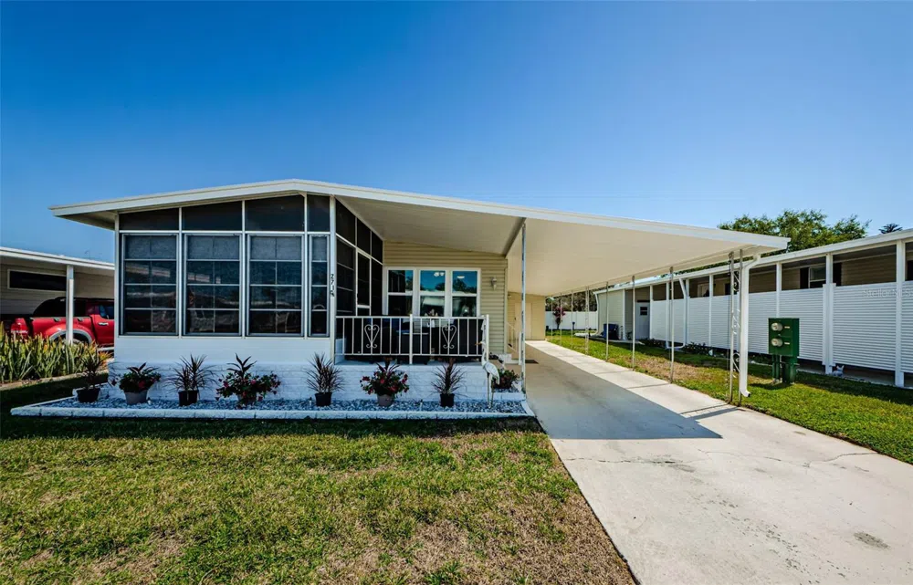 Incredible Price Adjustment! Priced to Sell! Don't miss this opportunity! Beautifully Updated & Move-In Ready in Tarpon Shores 55+ Community! This stunning, beautifully furnished home boasts incredible curb appeal and shows like a model home. The updated kitchen features newer appliances, ample cabinet space, and soft-close drawers, seamlessly opening to the dining and living areas, creating an inviting space for entertaining. The spacious primary suite includes a walk-in closet, an en suite bath, and a private water closet with a step-in shower. A Jack-and-Jill guest bathroom offers dual sinks, a tub/shower combo, and a cabinet for your towels and linens. Enjoy a private backyard with a white vinyl privacy fence, an enclosed Florida room with updated windows (2005) and A/C for year-round comfort, plus a covered front porch—perfect for relaxing or entertaining. Additional highlights include new windows (2023), new A/C unit (2021). The 4-point inspection report from 2021 shows primary roof with 36 years life left and secondary metal roof with 29 years life left. Newer vapor barrier with a lifetime guarantee. The home features easy-care vinyl plank flooring throughout, with newer carpet in the primary bedroom. A laundry closet in the kitchen with a full-sized washer, dryer, and extra storage adds convenience. The long carport accommodates 2–3 cars, and a spacious storage shed provides even more space. Low taxes and no flood insurance required. This home is truly move-in ready. Tarpon Shores is a golf cart friendly community with fantastic amenities, all included in the low $315 monthly HOA fee. Residents enjoy lawn maintenance, water, sewer, trash/recycling, irrigation, internet, wi-fi and expanded cable with premium channels like Disney, HBO, and NFL. The community also features a clubhouse with numerous social activities, heated pool, shuffleboard courts, bocce ball, pickleball, horse shoe pits, billiards, library, Kitchen, and laundry facility. Conveniently located near Publix, Walmart, golf courses, Gulf beaches, parks, the historic district, and the world-famous Tarpon Springs Sponge Docks, this home offers easy access to shopping, dining, medical facilities, and entertainment. The land share value is included in the price and can be financed through Tarpon Shores MHP. Do not miss this incredible opportunity—schedule your showing today!