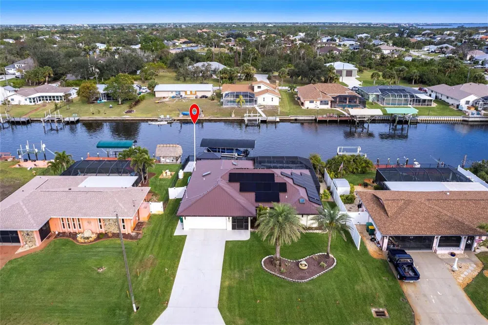 This spectacular home is a boater’s dream – just minutes to the open water of Charlotte Harbor! This sailboat waterfront SOLAR POWERED pool home with 3 bedrooms and 2 baths has direct access to beautiful Charlotte Harbor and then on to the blue waters of the Gulf of Mexico. Bring your boat and other watercraft. There’s a 12,000 lb covered boat lift, an 8 by 48 dock, and 80 feet of water frontage. There’s plenty of room for family and friends with over 1800 square feet of living space, living, dining, family room (currently used as formal dining room) spacious kitchen, and extended paved lanai and sun deck overlooking the beautiful, heated pool and wide waterway. Invisible pocket sliders in the living area provide an unobstructed view of the pool area and waterway and allow the outdoors to become an extension of your indoors. Tasteful appointments include decorator light and fan fixtures; recessed lighting; color accent walls; soaring vaulted ceilings, blinds, new flooring, and new base boards throughout; and updated kitchen and baths. The kitchen is a culinary enthusiast’s dream boasting stainless appliances, warm wood cabinetry, granite counters with tile back splash, casual dining area, and breakfast bar. Plus, the pass-through window to the lanai makes for easy entertaining. Retreat to your master suite with walk in closet and beautifully updated en suite bath with his and hers decorative bowl sinks and seamless glass, custom tiled shower. Two other bedrooms on the other side of the home will provide privacy for you and your guests. The guest bath has direct access to the pool area. So, no more “puddles” in your home! The lanai with decorative brick pavers and in ground spa will be your favorite spot to relax or laze in your heated saltwater pool enjoying the view of the beautiful waterway. Stroll down to the brick paved deck on the water to sunbathe or watch the wildlife and waterfowl that abound in this area. Other key features include whole house generator, storm shutters, and hurricane code garage door for peace of mind during inclement weather; new metal roof in 2022 with 30-year warranty; water softener; dedicated laundry room; tankless hot water heater; well fed irrigation system; and public water service for convenience and reliability. Beautiful curb appeal with landscape curbing, mature palms, and flowering shrubs. Proximity to local beaches, dining, shopping, and golf courses makes this property ideal for the Florida lifestyle. Also, easy access to waterfront public parks with bike and walking trails and picnic areas, and boat ramps providing access to many waterways, beautiful Charlotte Harbor, and the Gulf of Mexico. Lots to do in the area including kayaking, pickleball at the Punta Gorda Pickleplex, municipal marinas and playgrounds, local YMCA, public tennis courts, nature preserves, wildlife sanctuary, farmer’s market, and the list goes on! Historic downtown Punta Gorda and popular Fishermen’s Village with quaint shops and cafes nearby. Quiet waterfront neighborhood, yet all amenities and conveniences nearby. So, don’t wait to grab your piece of Florida paradise! **PLEASE ENJOY THE 3D INTERACTIVE VIRTUAL TOUR ASSOCIATED WITH THIS LISTING