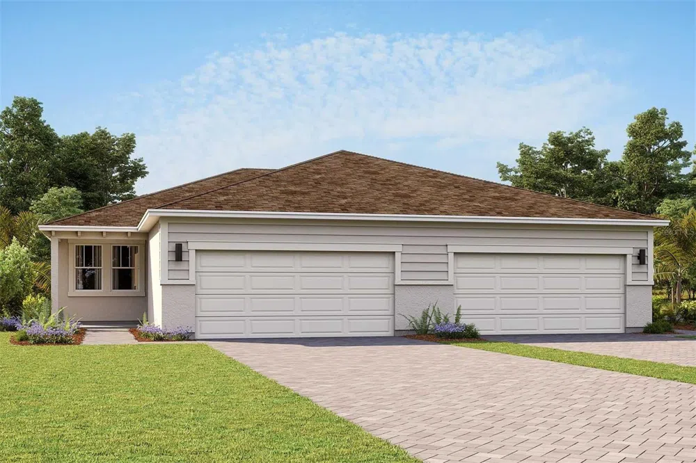 Under Construction. This stunning Coastal style "Largo" villa is located in Timberdale at the popular new community of Chapel Crossings in Wesley Chapel. This 1,431 square foot Largo open floor plan offers two bedrooms including a spacious owner's retreat, two bathrooms, a Study and a two car garage. The inviting exterior boasts a paver driveway, walkway and entryway and a lush landscaping package. Planned throughout the interior are shaker style cabinets painted Stone Gray with 42-inch uppers in the kitchen quartz countertops and a tile backsplash. Wood inspired plank tile flooring runs throughout all the common areas. This home also features a large screened in paver lanai, and finishes like stainless steel appliances, including the refrigerator, and cabinet hardware. The amount of natural light the upgraded 12' sliding glass door gives the feeling of a space much larger than the square footage would suggest. The owner's suite is large enough for a king sized bed and has en suite with oversized shower, dual sink raised vanity and walk-in closet. Bedroom 2 is located at the front of the home with a full secondary bathroom. The study is located just off the foyer and makes a great space for home office, hobby room or even formal living! The front porch even has room for rockers or a small seating area. All villas come with a complete smart home package, and best of all your HOA includes exterior maintenance of the lawn and landscaping! Wesley Chapel has quickly become known in Tampa for its new shops and area conveniences, great schools and great entertainment. Estimated completion March 2025. Photos, renderings and plans are for illustrative purposes only and should never be relied upon and may vary from the actual home. Pricing, dimensions and features can change at any time without notice or obligation. The photos are from a furnished model home and not the home offered for sale.